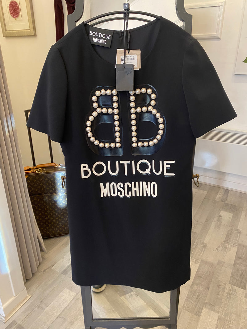 Pre Loved Boutique Moschino Pearl Logo Black Dress UK8 (new)