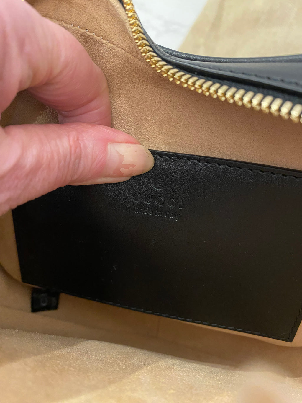 - Signature Interlocking G in gold tone logo plaque