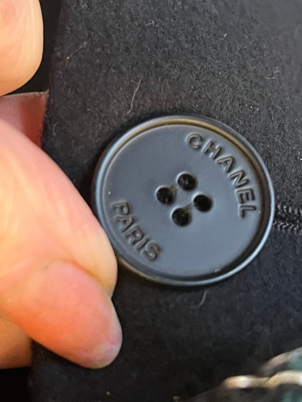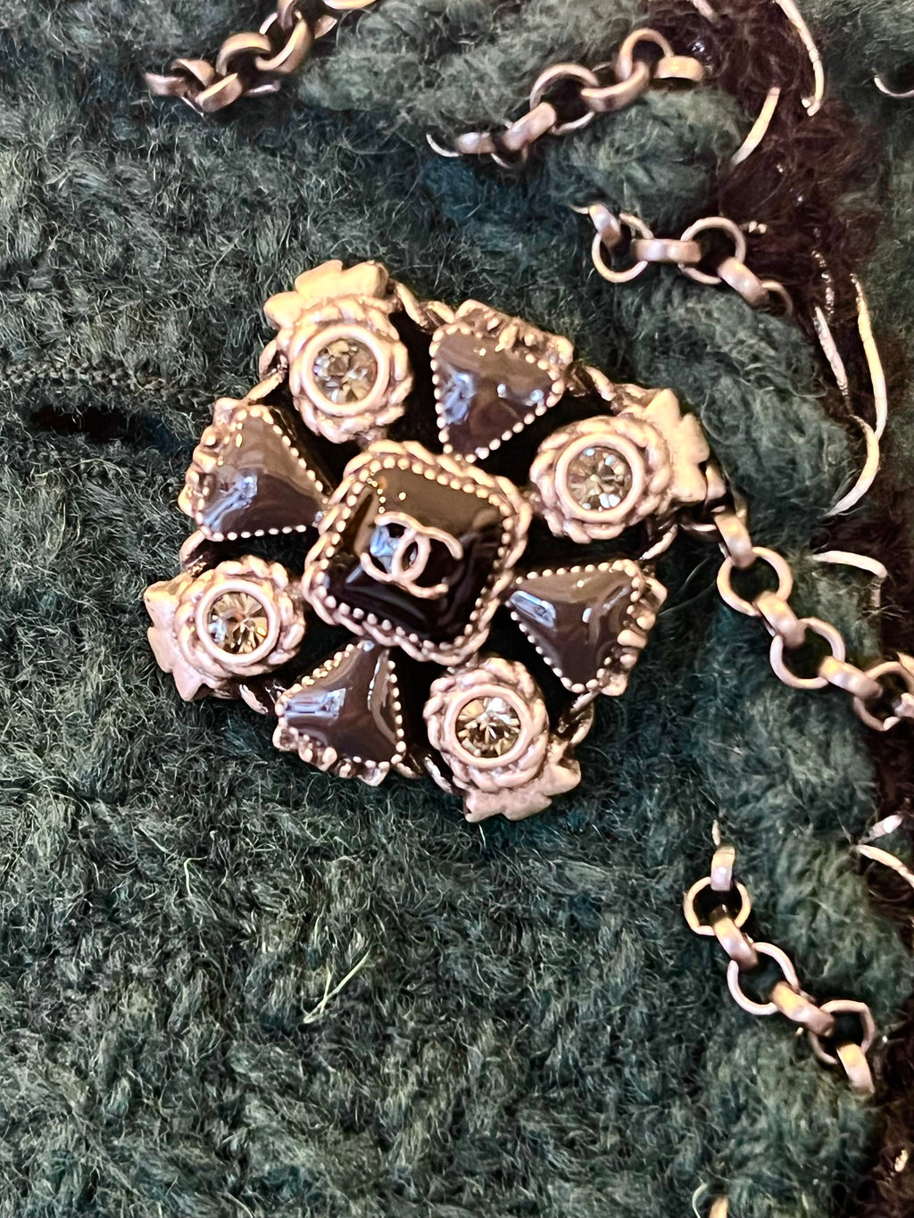 • Black and silver tone buttons with crystal detail and Chanel CC logo on green jacket