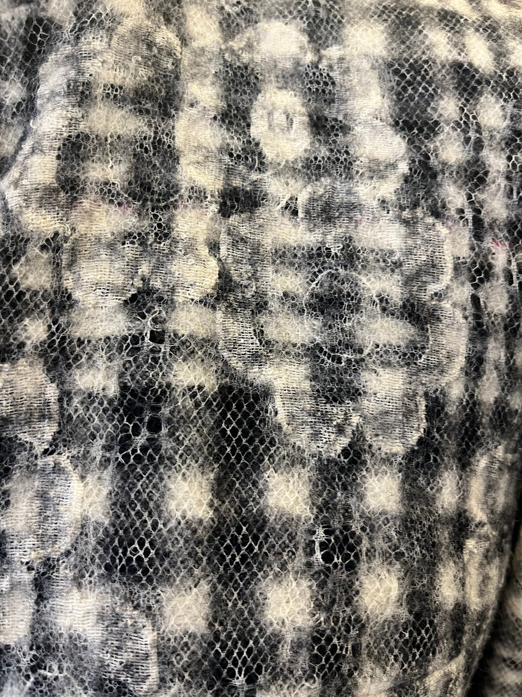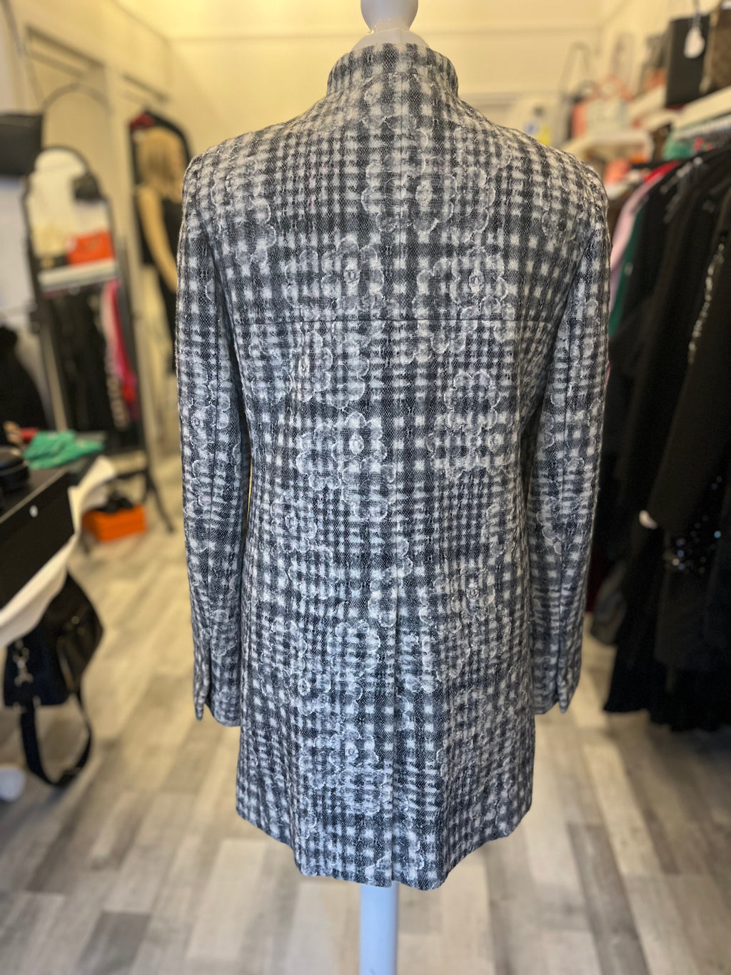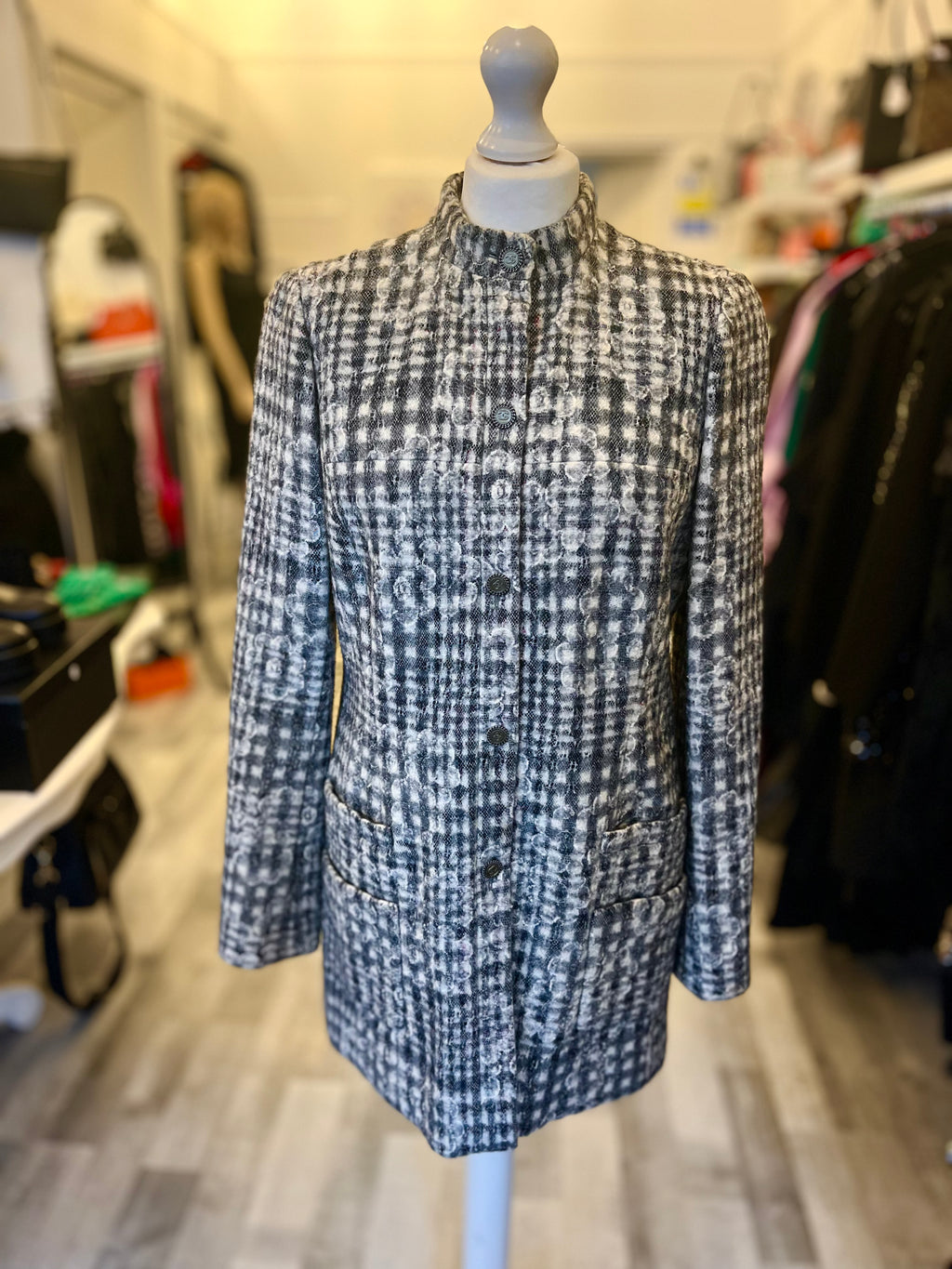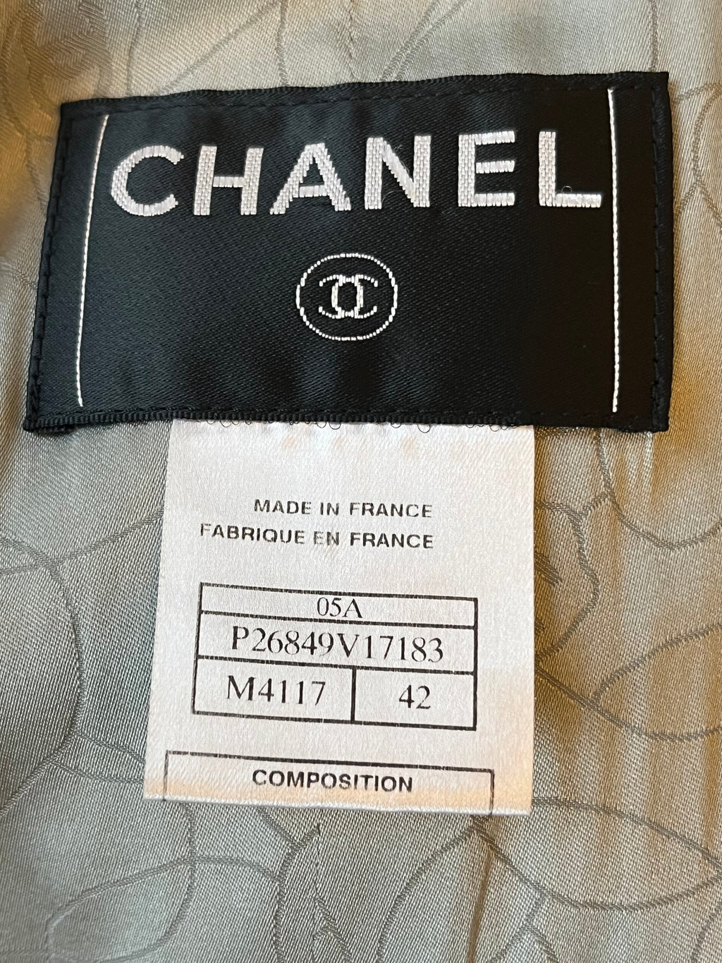 - Pewter tone buttons with chain detail and Chanel CC logo (5 on front, 3 on each cuff)
