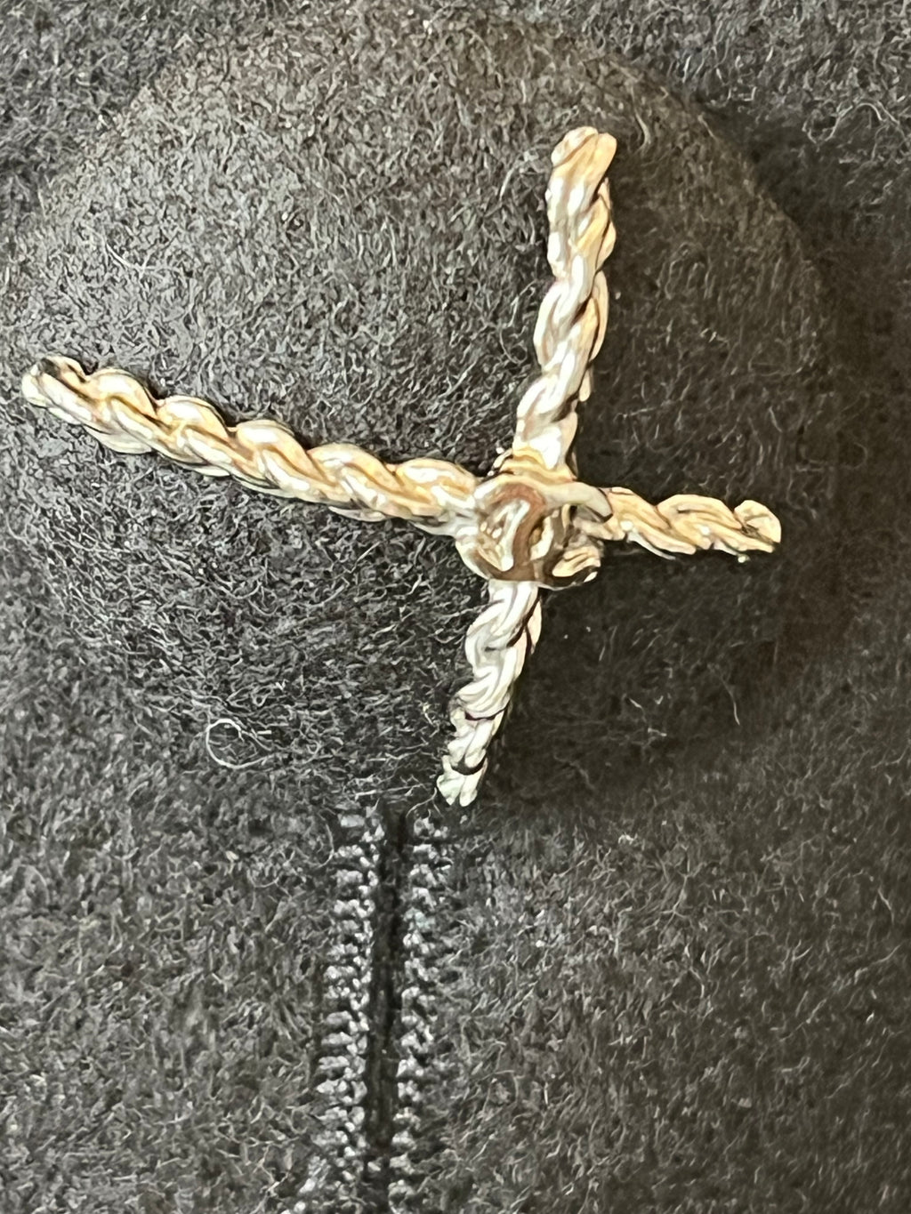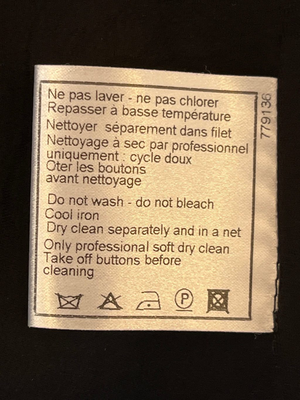 - Black wool buttons with pewter tone chain detail and Chanel CC logo