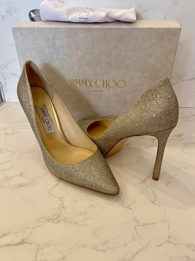 Pre Loved Jimmy Choo Romy 100 in Champagne Glitter uk6.5