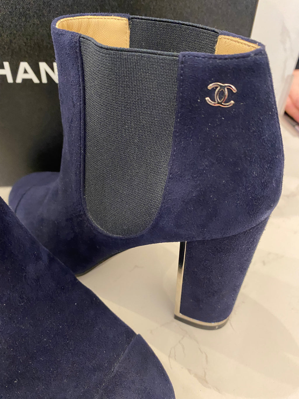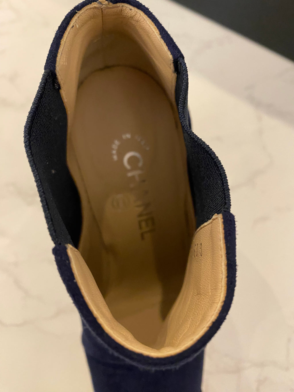 • Pre Loved Chanel Navy Blue Suede Ankle Boots UK4