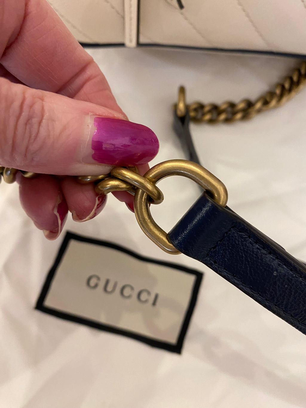- Detachable and adjustable strap in gold tone chain & navy leather